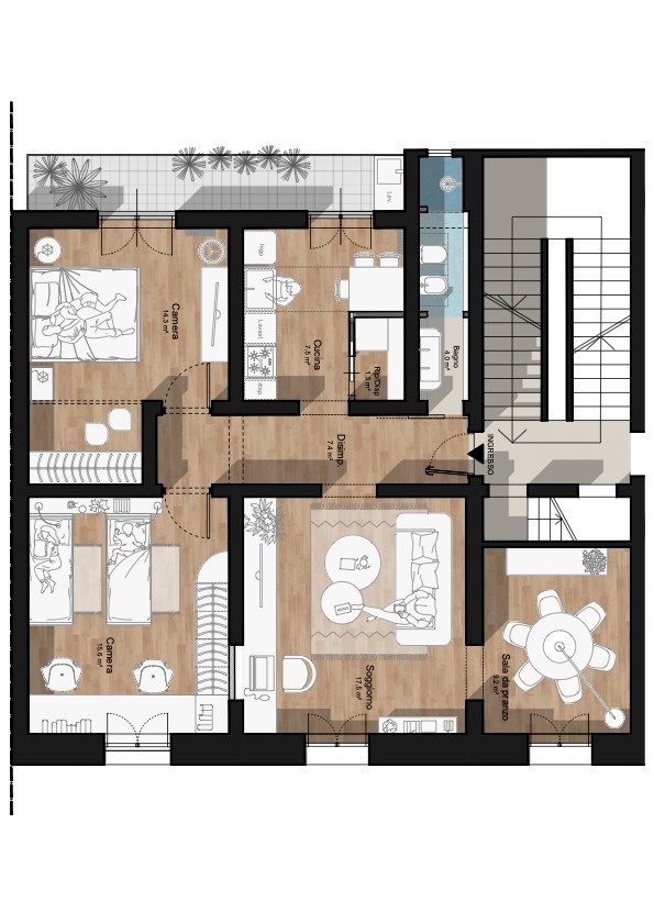 Ho due ampie camere matrimoniali, pronte a custodire i tuoi sogni. Il soggiorno, con la sala da pranzo adiacente (o studio, se preferirai), sarà il cuore della casa, dove intrecciare momenti di condivisione o ispirazione.